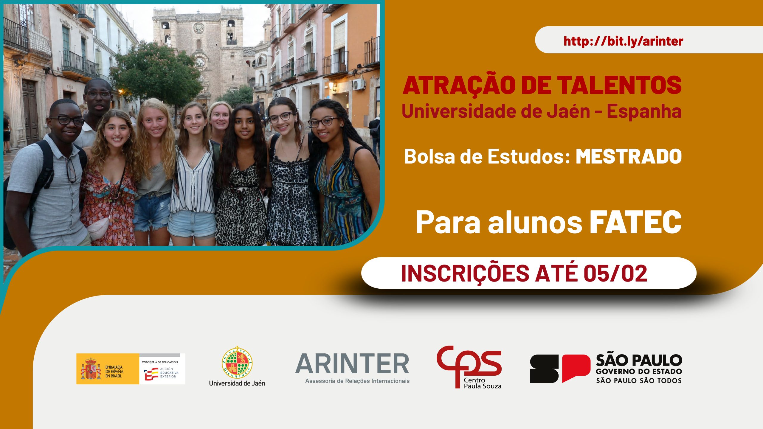 Estão abertas as inscrições para o Processo Seletivo de Estudantes das Faculdades de Tecnologia (Fatecs) interessados em participar do Programa de Atração de Talentos de Mestrado na Universidade de Jaén, na Espanha. A iniciativa é promovida pelo Centro Paula Souza, por meio da Assessoria de Relações Internacionais (ARInter), em parceria com a Consejería de Educación da Embaixada da Espanha no Brasil.