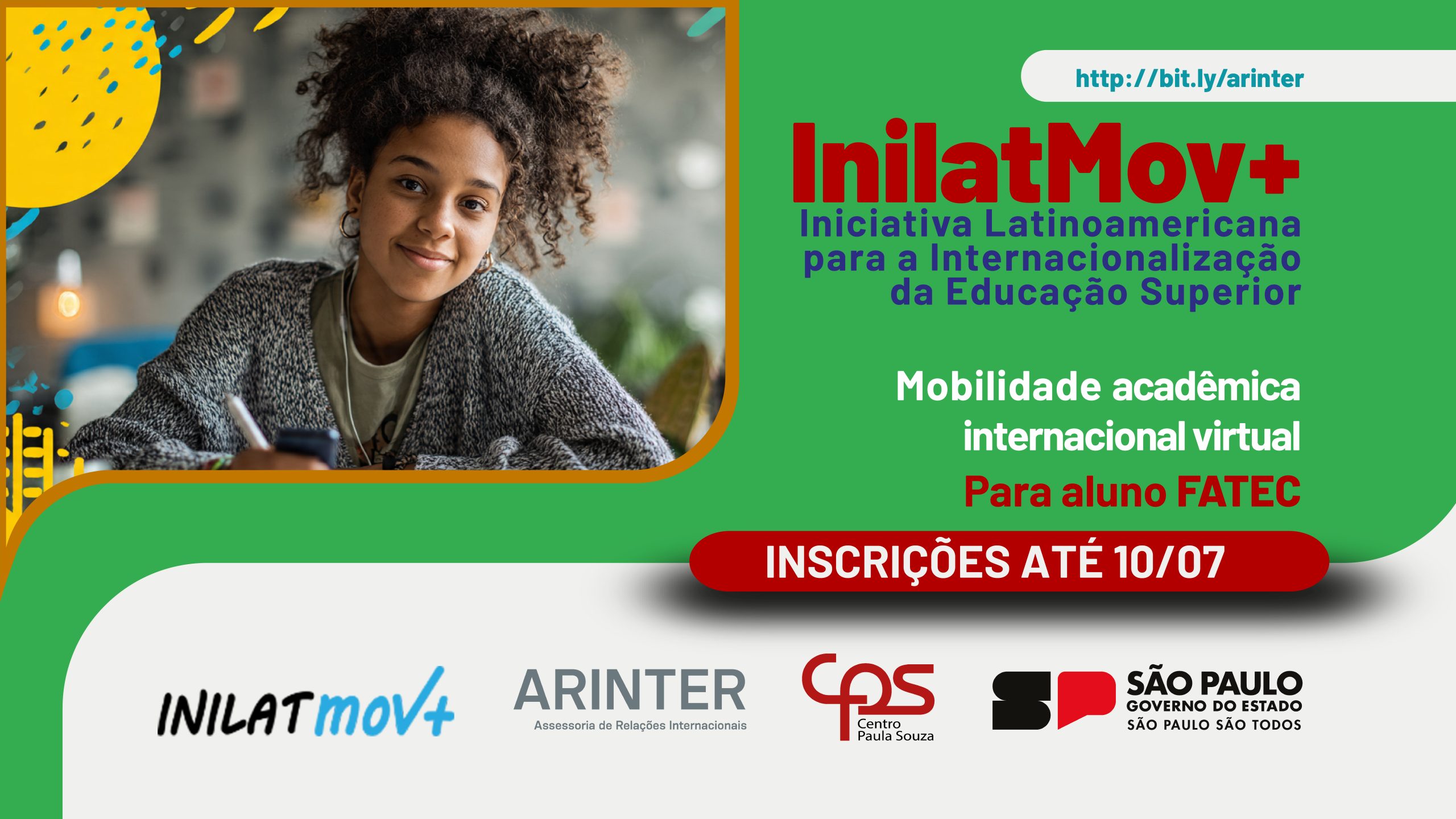A Assessoria de Relações Internacionais (ARInter) do Centro Paula Souza torna pública a abertura de inscrições para o Programa INILATmov+, iniciativa de mobilidade acadêmica virtual voltada a estudantes de Fatecs. O programa integra a Iniciativa Latinoamericana para la Internacionalización de la Educación Superior e tem como objetivo ampliar o acesso à internacionalização por meio de disciplinas e cursos ofertados por Instituições de Ensino Superior (IES) estrangeiras, em formato online.
